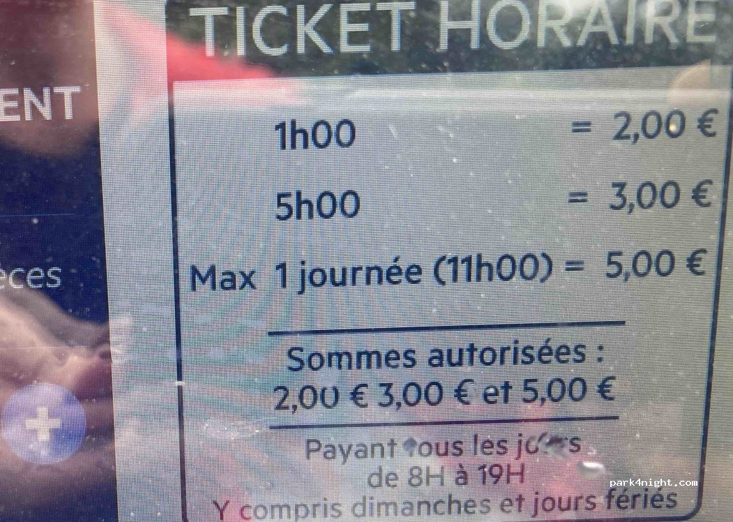 2 Parkings payants de 9 h a 19 h dimanche et jours fériés. Interdit de 20h à 08h.