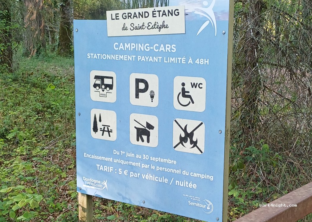 Parking arboré situé au bord de l'étang de Saint Estéphe, très calme, tables de pique-nique, à 200 m de l'eau. Payant du 1 juin au 30 septembre 5€/nuit limité à 48 heures. Vidange des eaux et eau propre gratuit. Très ombragé.
