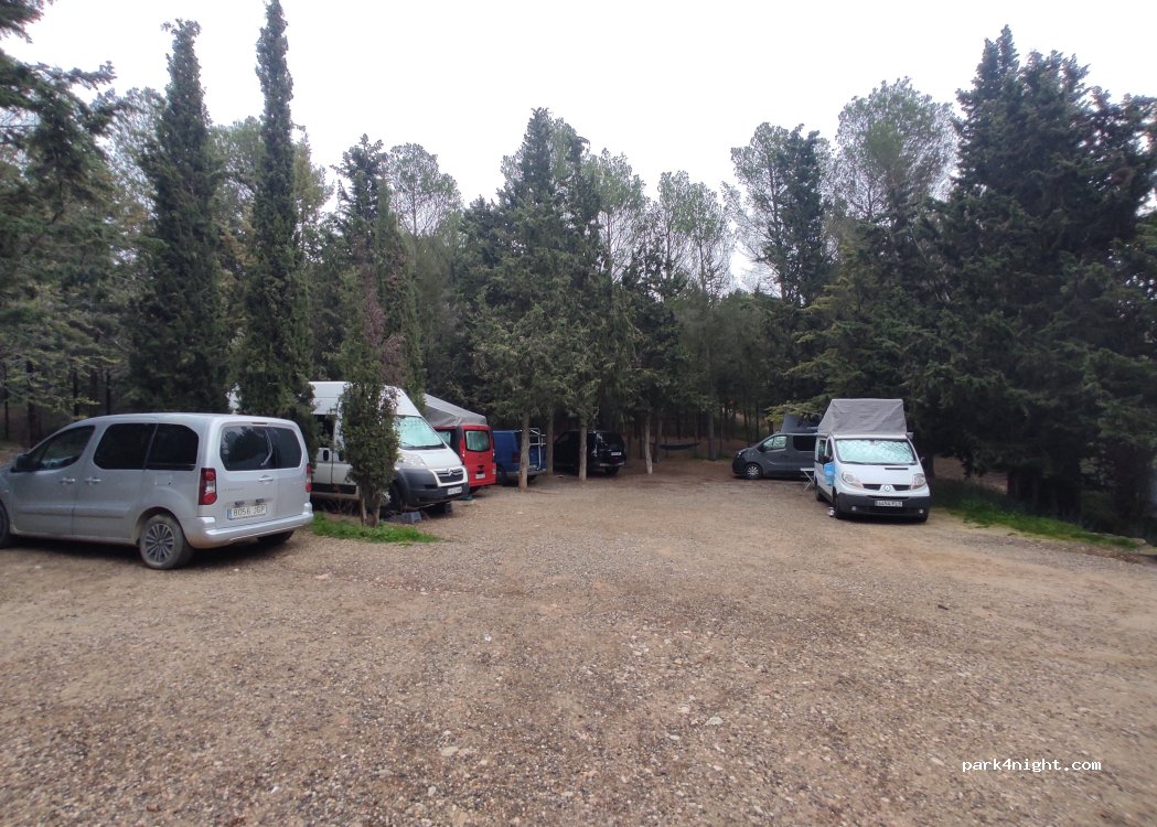 Nit súper tranquila en mig dels arbres, amb font, contenidors d'escombraries, taules de pícnic i barbacoes. Llàstima que l'entorn està força brut. Terreny prou anivellat.