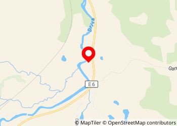 Long dirt track preceding north from the south lane of the E6. Space for a lot of vehicles. Space to turn around for a 6m VW Crafter, but otherwise best to reverse in carefully. Close to the road but protected by an embankment and the noise of the rapids nearby. Lovely very convenient spot!