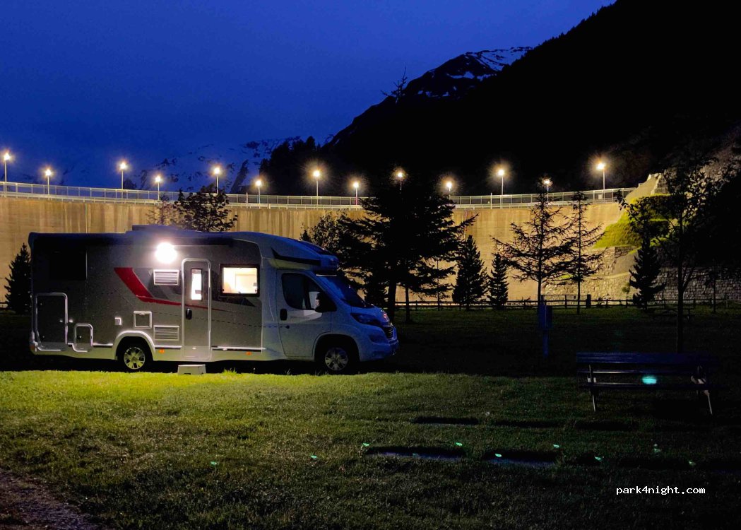 Camper area at the foot of the dam. Large,quiet, flat, open area with EHU points and picnic tables dotted around. Showers and WC. Views up or down valley depending where you park. Ideal for hiking trips in the Grisenche valley.