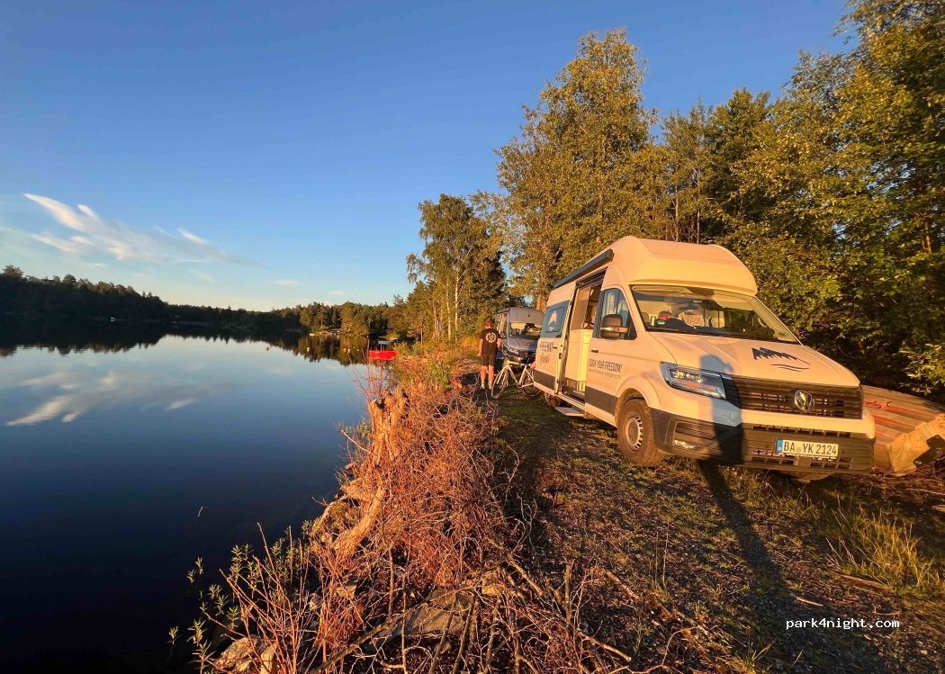 One of the most beautiful park ups we have ever stayed in. Not suitable for bigger campers (we are a VW T6) and would recommend reversing down the slope. Right on the waters edge, very secluded and peaceful. Right next to the road but hardly any cars and no street lights. We swam multiple times through the evening and not many flies even though on the water.