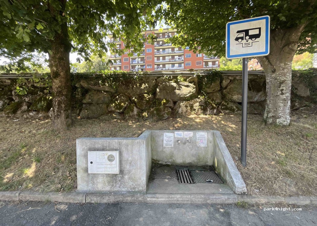 Pas pratique pour vidanger les eaux grises car en pente. Pas d'eau (la borne avec les robinets sur la photo n'existe plus, elle a été retirée). Le stationnement est possible avec cales mais pas très pratique. Déconseillé aux gros véhicules et/ou avec remorque.