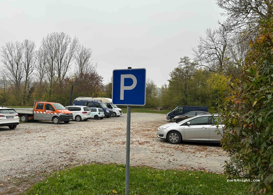 Large public gravel parking lot on the edge of a meadow on the Main, very quiet.