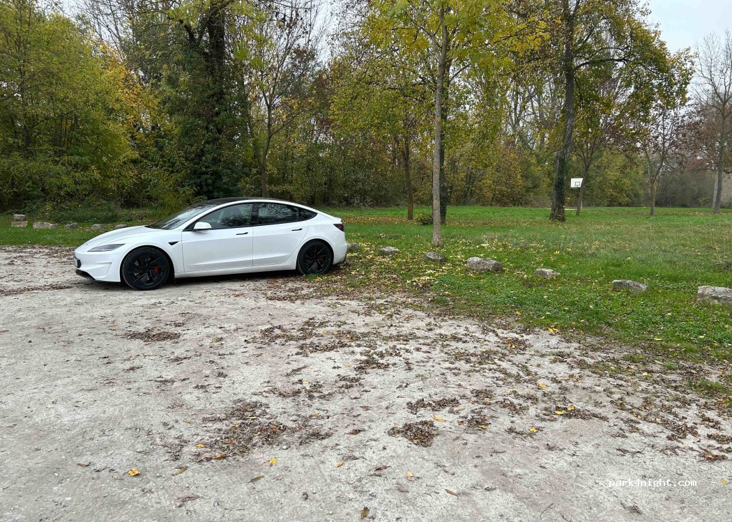 Grand parking public en gravier sur le bord d'une prairie sur le Main, très calme.