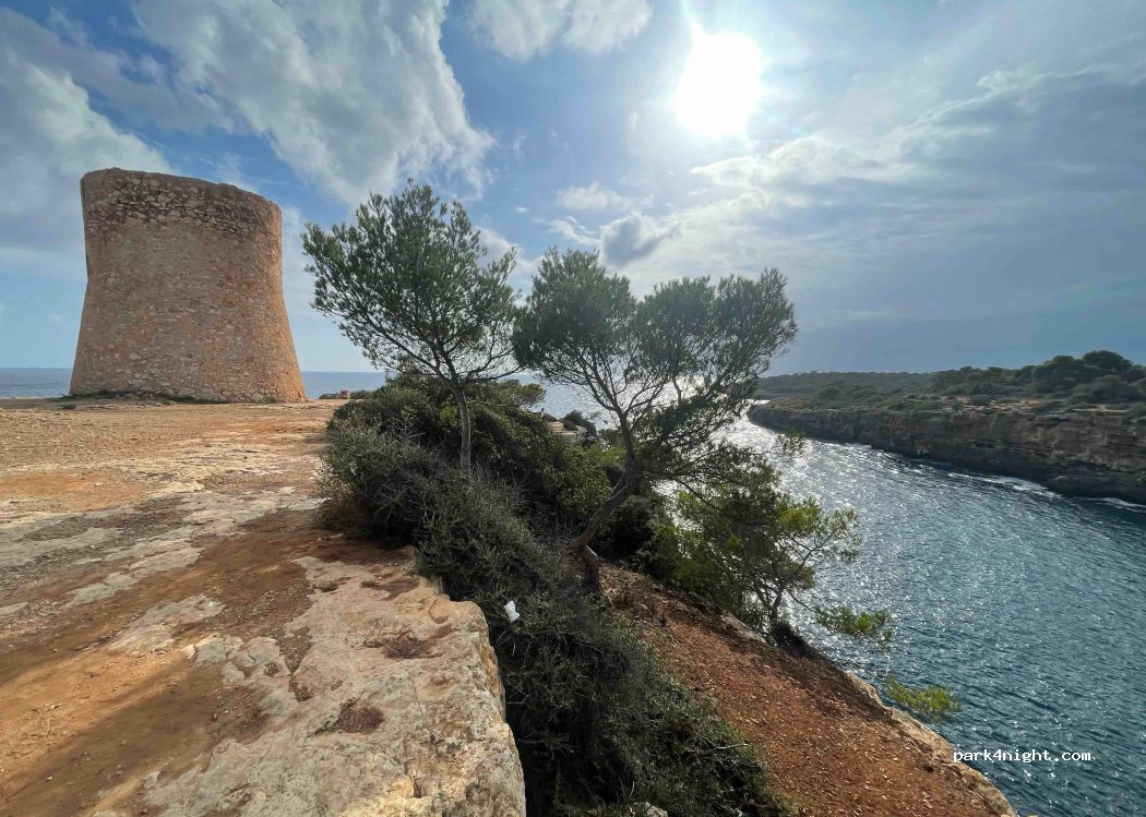 Aparcamiento urbano tranquilo en horario nocturno, cerca de la cala y con acceso a una antigua torre de vigilancia.
