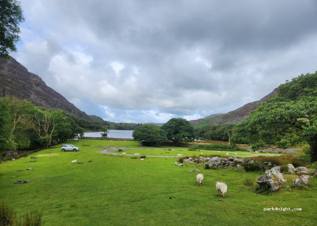 Amazing place. We were looking for something off the beaten track and this was perfect. Its a tight squeeze up the roads - our Citroën Discovery made it with ease but it does mean only the brave will make it. parking with sheep running around and a beautiful view of the lake. there are firepits so bring some wood with you and of course there are no other facilities or services.