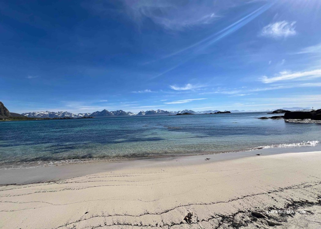 Bonito lugar para descansar y dormir. Playa de arena blanca, paseos y barbacoa. Vistas estupendas a islas Lofoten. Baño público 10 Kr. Cuidemos del entorno. Respiremos. Gracias.