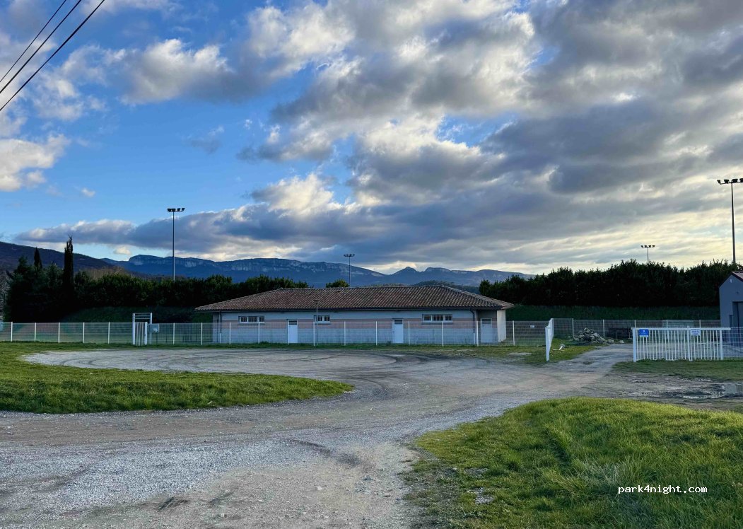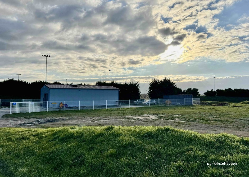 Parking du stade, herbeux et isolé.