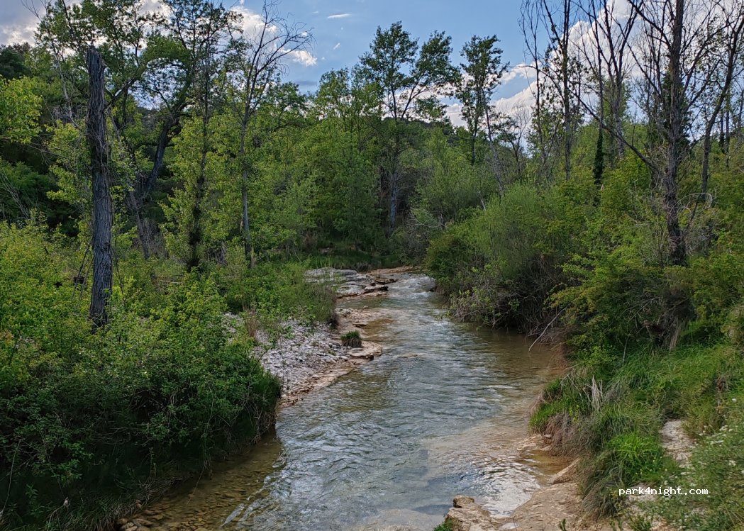 Nice spot on the rio vero to swim or spend a night. Arriving from Alquezar take the small path that loosen to the right of the road and go to the end. Enough room for 2 or 3 vans.