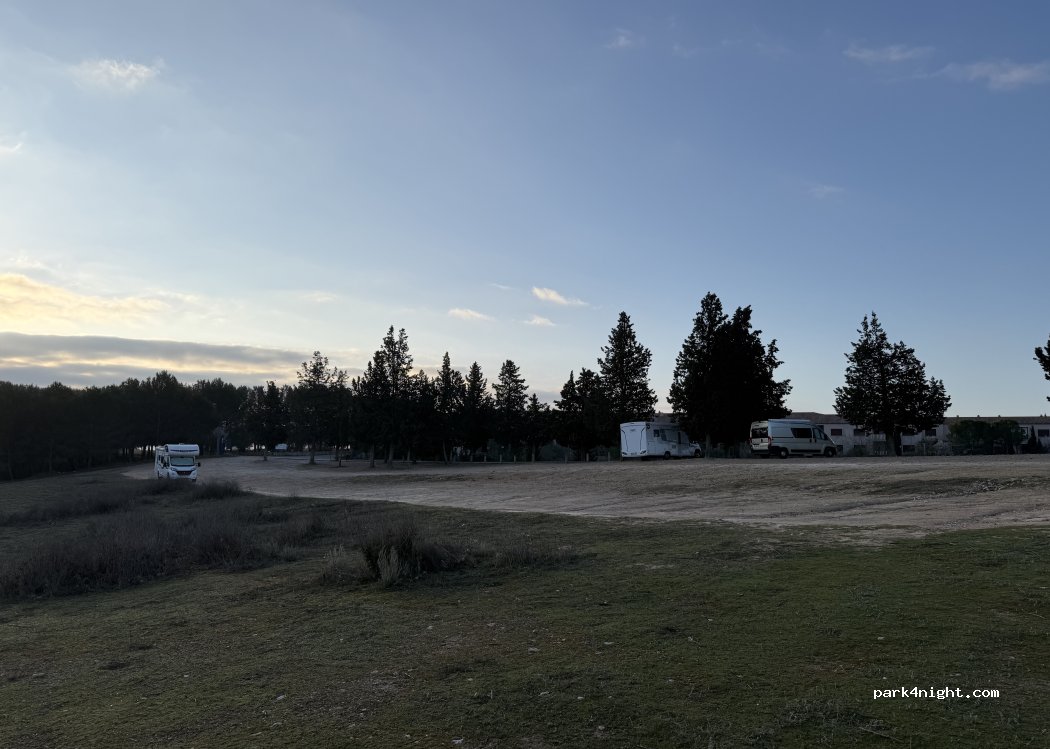 Aparcamiento de tierra junto al castillo de Belmonte. El terreno tiene desnivel, aunque hay zonas llana. Buenas vistas al castillo y los molinos. Noche muy tranquila.
