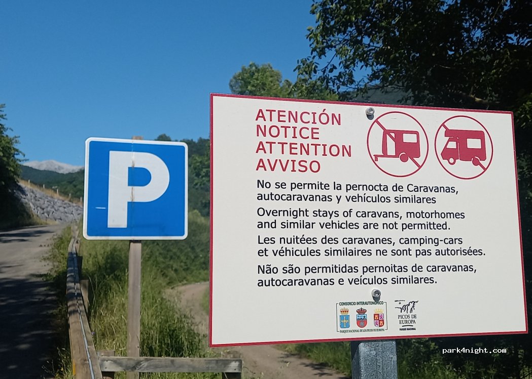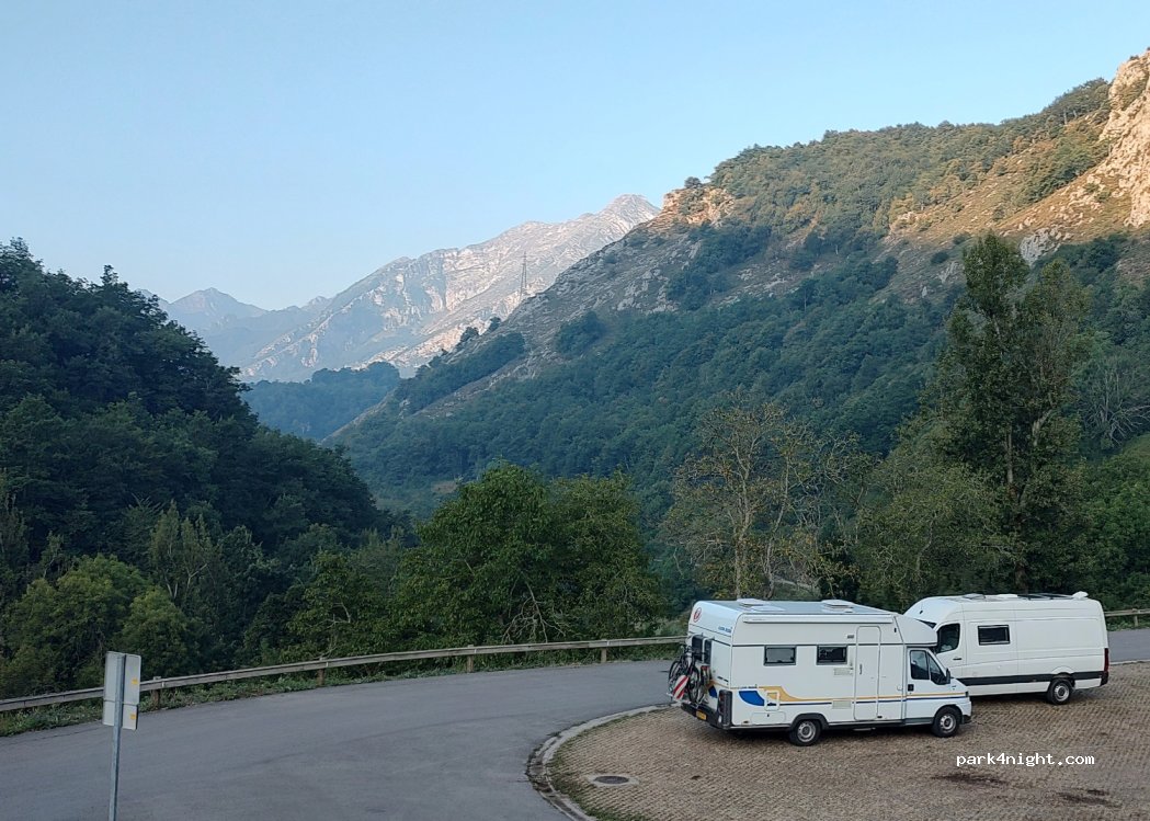 Un parking calme, propre, de niveau à quelques minutes à pied du village de Soto, où un bar est ouvert et où part un très beau chemin de randonnée vers les Picos de Europa. Point d'eau présent à côté du parking !