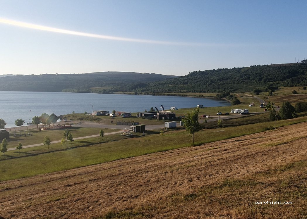 Maravilloso sitio para pasar unos días. Gran zona verde para aparcar justo al pie del lago. Kiosko muy agradable con terraza acristalada, buenos productos y excelente atención. Hay también alquiler de bicicletas eléctricas, kayaks y tablas de paddle sur. Duchas y baños públicos. Servicio de vaciado y llenado gratuito en el pueblo a 500m. Calma absoluta por las noches, y ambiente familiar durante el día.