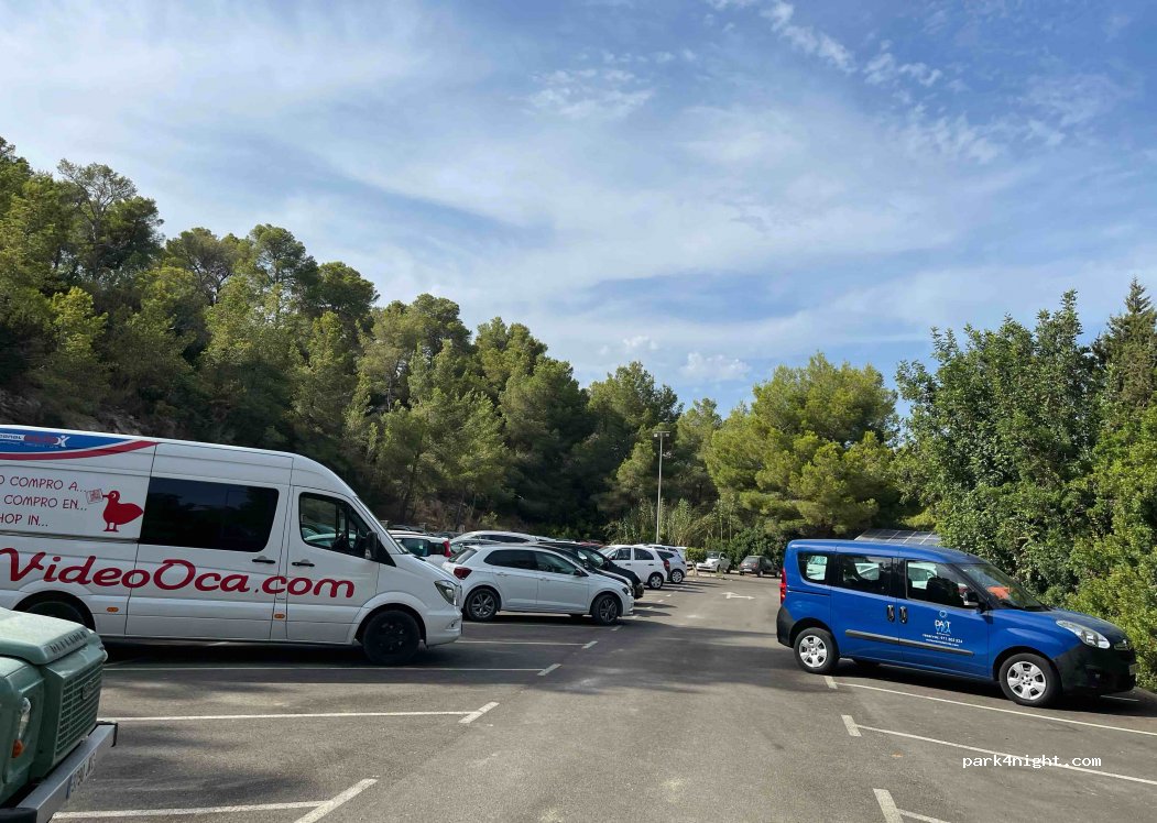 Excellent place to spend the night, easy to access, flat parking, the far left corner is shady even until late in the morning. It’s quiet. Right next to the town where there are some bars and restaurants, town has a chilled family vibe with a family friendly beach. But just 15 minutes walk away is the Cala Xuclà- a beautiful little beach just type it into google very much worth spending the day at instead.