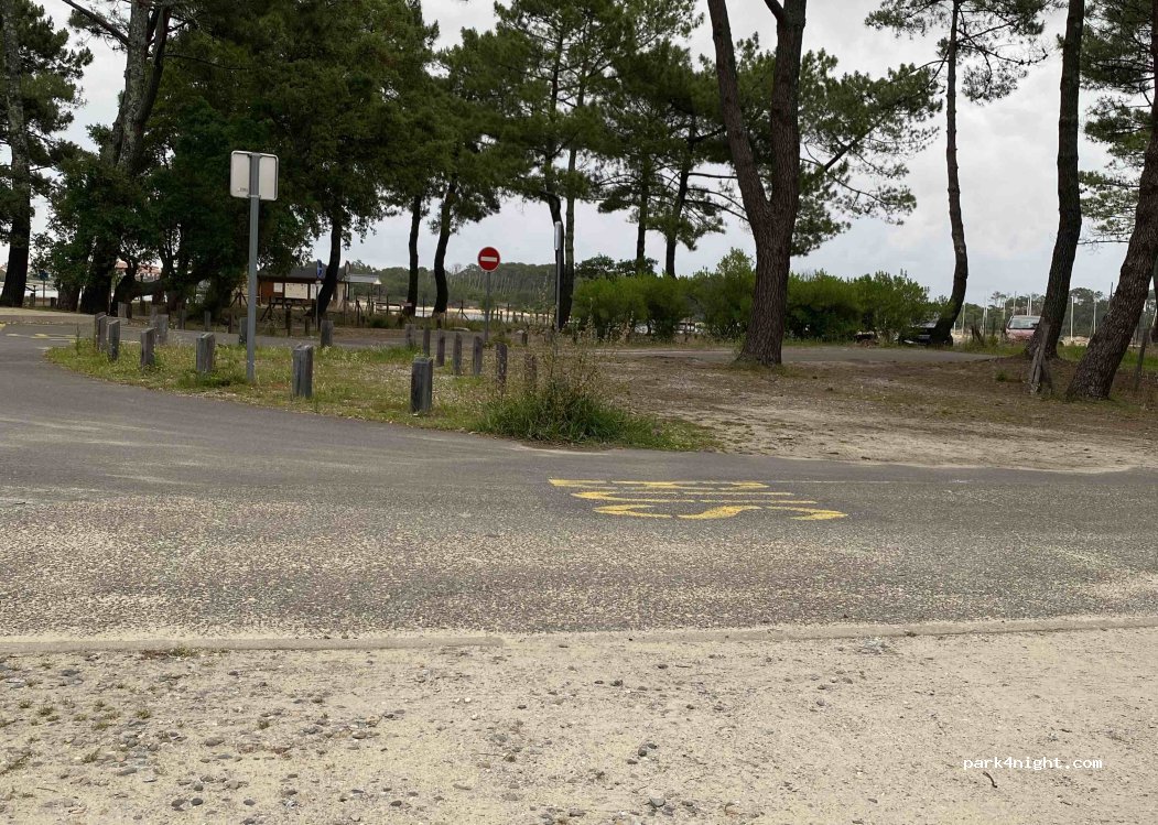 Parking by the lake, very pleasant. Next to the nautical center. Pine trees, sun, tables to eat ... Passage of walkers. Height limited to 1.90 m but the day of my visit (early September) the height bars are removed. People in sedan van, but note that there is a paid motorhome area just behind!