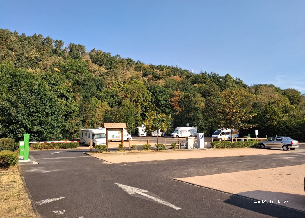 Bon emplacement.On peut déployer le store et installer table et chaises. Aucun problème puisque c'est une aire de camping-car. Tarif 5 € les 24h. Bus pour centre ville de Riom à l'entrée de l'aire.