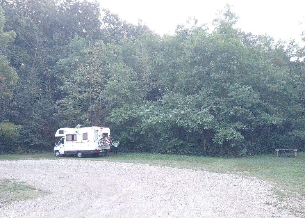 Parking très tranquille entouré de verdure idéal pour un arrêt d'une nuit.