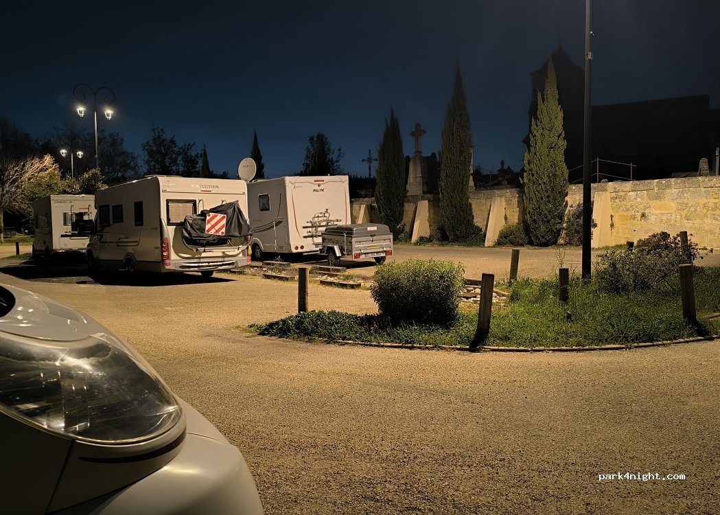 Le succès de ce spot ne se dément pas. Ce soir nous sommes 3. la place pour 2 est prise par 1 cc ! En même temps 2 cc a cet emplacement...c est trop serré. Nous prenons donc 3 places de voiture sur le reste alouees aux voitures. A 20h00 ce jeudi soir il y a peu de monde à honorer les défunts . il y a aussi le parking en face de la mairie, sans barrière de hauteur et plat. a 200 m, sans la vue.