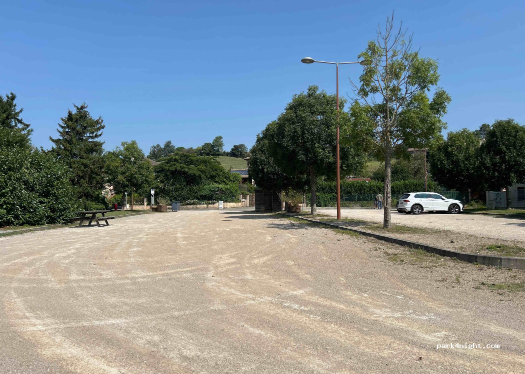 Parking plat et propre dans un joli village avec commerces, bien pratique pour contourner Lyon. Notre chien a été perturbé par les bruits de pétard toute la journée ( sans doute destinés à effaroucher les oiseaux dans un verger)