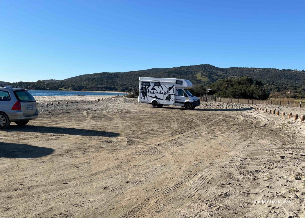 Parking de jour juste en face d'une longue plage de sable fin. Camping juste à côté. Pas d'ombre. Route non goudronnée et étroite pour un gros camping car.