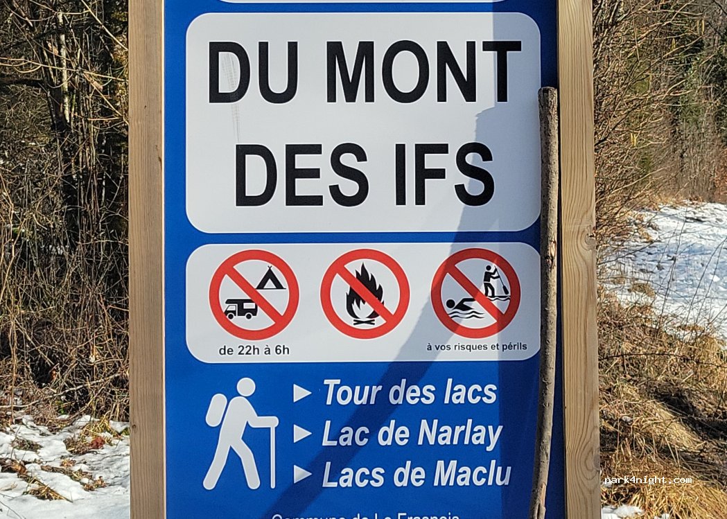 Parking du Mont des Ifs (3 espaces de stationnement). Dans les bois mais assez dégagé. Pas de vue mais un point de vue superbe sur le lac de Narlay à 500m à voir (belvédère du Mont des Ifs). Idéal pour tranquillité avec chiens. Aucun service. Nuitée interdite.