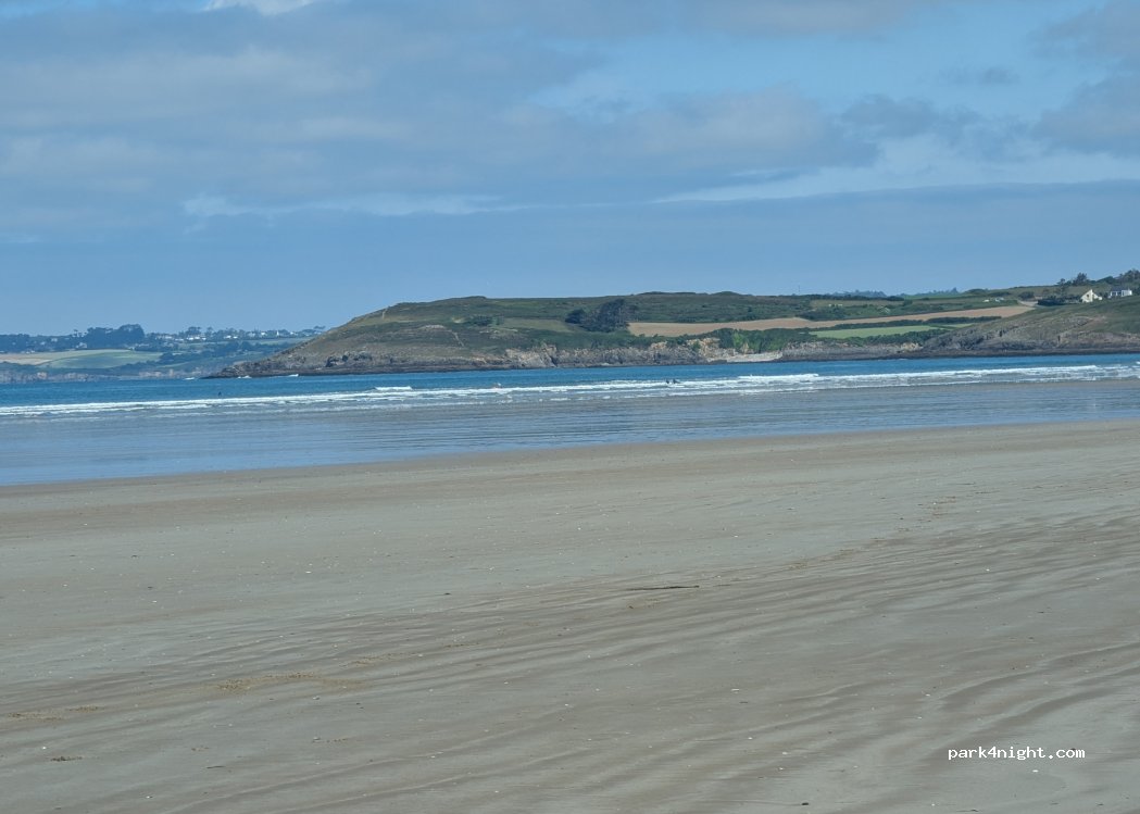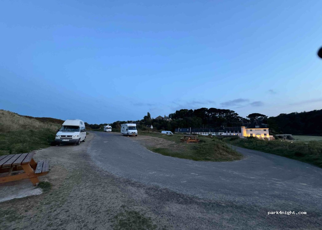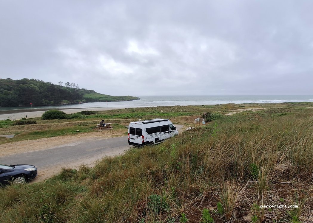 Petit parking très légèrement en pente. vue sur la plage magnifique qui est facile d'accès. Très calme. Aucun service. Parfait pour une ou 2 nuits.