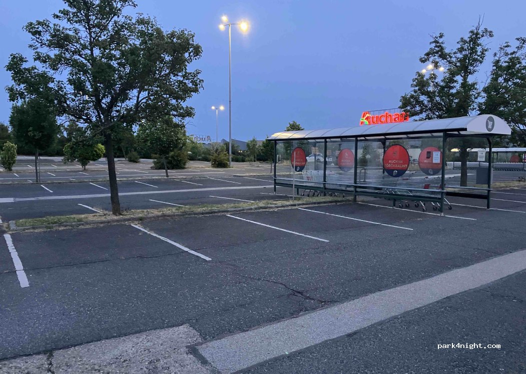 Auchan Hypermarket parking, we stoppes for 1 night, market is open 6.00 to 21.00, highway is not so loud, gas station in the parking, small shops in Auchan. Water tap is behind the gas station kassa building. Free wifi in the hypermarket. *no water tap anymore*