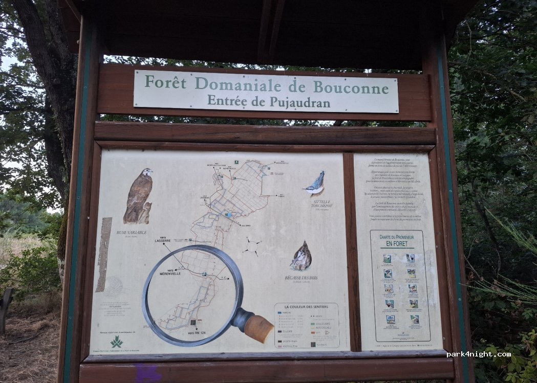 Parking in the forest. No restrictions aside from making fires. Less frequented than the main car park of the forest. But enough during the day by walkers and sportsmen (VTT). there are two large parking spaces. Very quiet except for the planes but it remains peaceful.