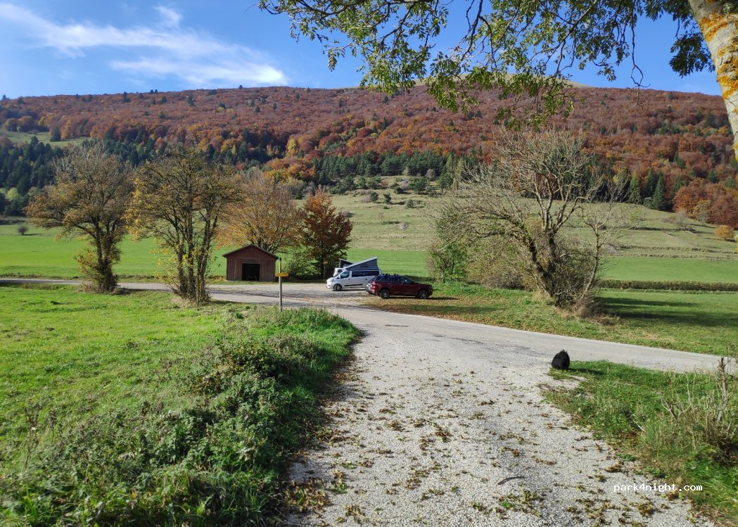 Bel endroit relativement plat. Qqs voitures et motos car route juste à côté mais rien de dérangeant. Ne pas hésiter à aller à la ferme en contrebas pour qqs achats(pain, brioche, fromage, charcuterie, bière) ou à remonter jusqu'au bout la route qui monte juste en face du parking. La vue y est magnifique !