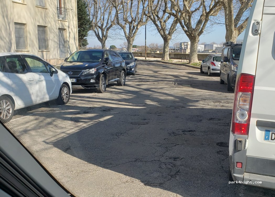 Absolument parfait pour visiter Arles en journée. le parking est gratuit et tranquille. il suffit de redescendre quelques 300m en bord de Rhône et passer le pont pour être en hypercentre. Sous les platanes c'est nickel par contre l'accès est compliqué pour les plus de 7m ou largeur 2.5m.