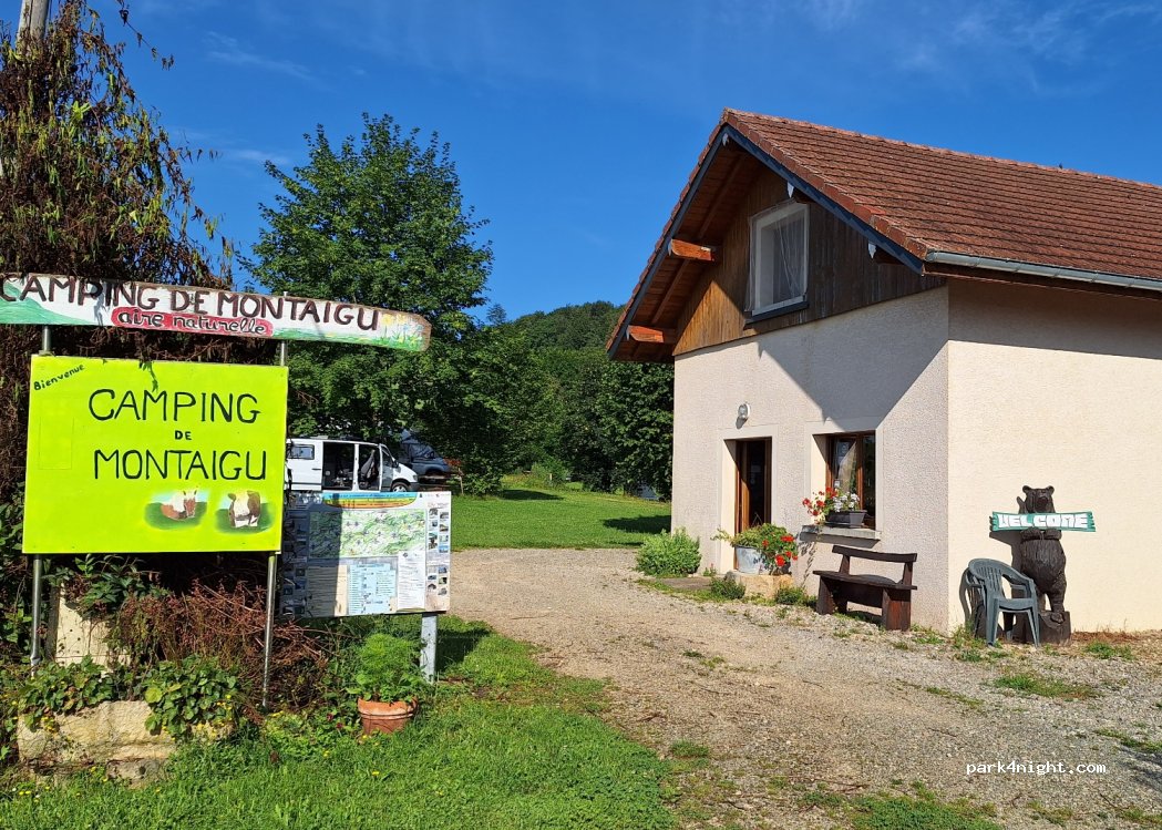 Campingplatz und Gîtes Montaigu. Naturgebiet auf einem landwirtschaftlich genutzten Gebiet mit Wasser, Strom, Toiletten, Warmwasserduschen, Spülbecken, Waschmaschine. Aufenthaltsraum mit TV, Broschüren über die Region, Kühlschrank, Tisch und Stühle. Eine Reisemobilstation mit Schwarzwasser- und Grauwasserableitung. Besitzer einladend und verfügbar. Eine Käserei mit Comté, Morbier, Cancoillotte in unmittelbarer Nähe Rasenplätze mit Bäumen. Der Ort ist den Umweg wert, schöne Spaziergänge. Hunde akzeptiert. Der Fernseher mit HD geht sehr gut und das orange 4G auch. Guter WLAN-Zugang von den Stellplätzen, keine Kreditkartenzahlung, Barzahlung oder B-Check oder Urlaubsgutschein.