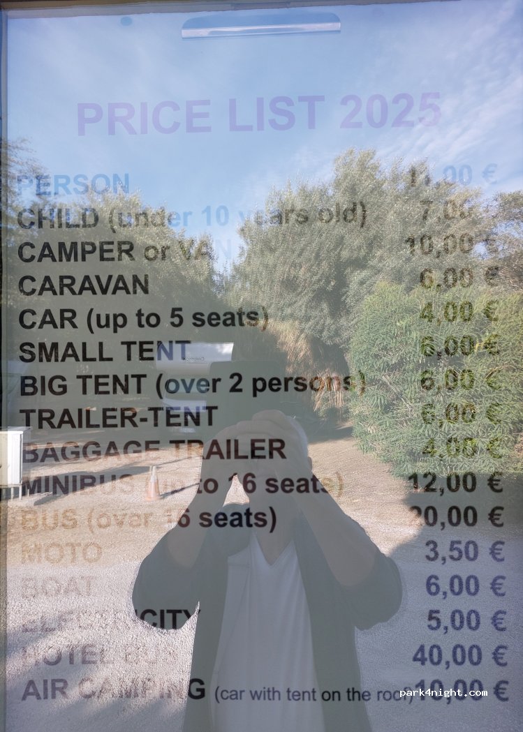 .. 60 euros a 4 avec van et petite tente et électricité. Camping bien ombragé. On y est venus car on a dû fuir le camping de nea makri qui a pourtant de bons commentaires bien que éloigné, sale et hébergeant en grand majorité des caravanes habitant à l’année