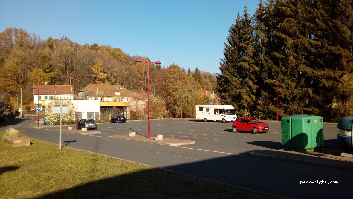 Troisfontaines altitude 300m. Valley of the Bievre. Nice parking of 50 places well enlightened cars, motorhomes accepted. Bakery, bank bingo, bank, small pizzeria / snack, nurses' office, beautiful bike path, playground, all within 100 m of the car park. Vallerysthal Cristallerie Factory Store 1 km away. Museum of the 2 hp 1 km. Do not miss the incline of Arzviller / Saint Louis 12 km and the rock of the Dabo 20 km. Col du Donon altitude 1009m in the Vosges 35 km