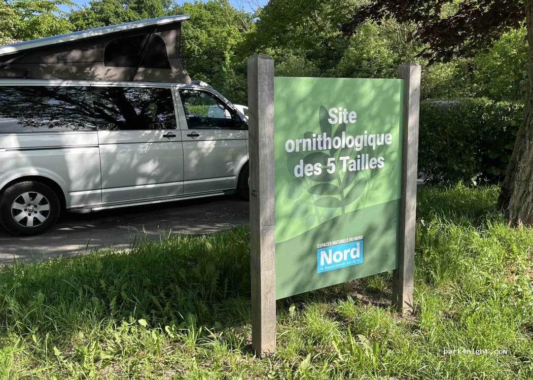 Parc ornithologique des cinq tailles. A côté de Thumeries, parking avec barre de hauteur mais pas en sortie. Sinon le long du parking 3 places. Forêt superbe et chemins de promenade. Observatoires. Nous n'avons pas testé de nuit