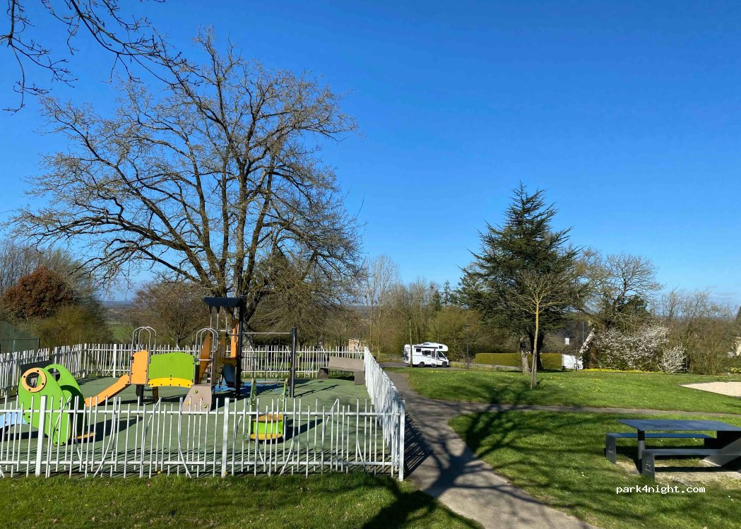 merci a la municipalité pour cette aire très propre , proche des commerces où le pain est bon . dommage que la route soit juste à côté, assez passante. jeux pour enfants, boîte à livres et toilettes publiques pas loin .services ok .on reviendra