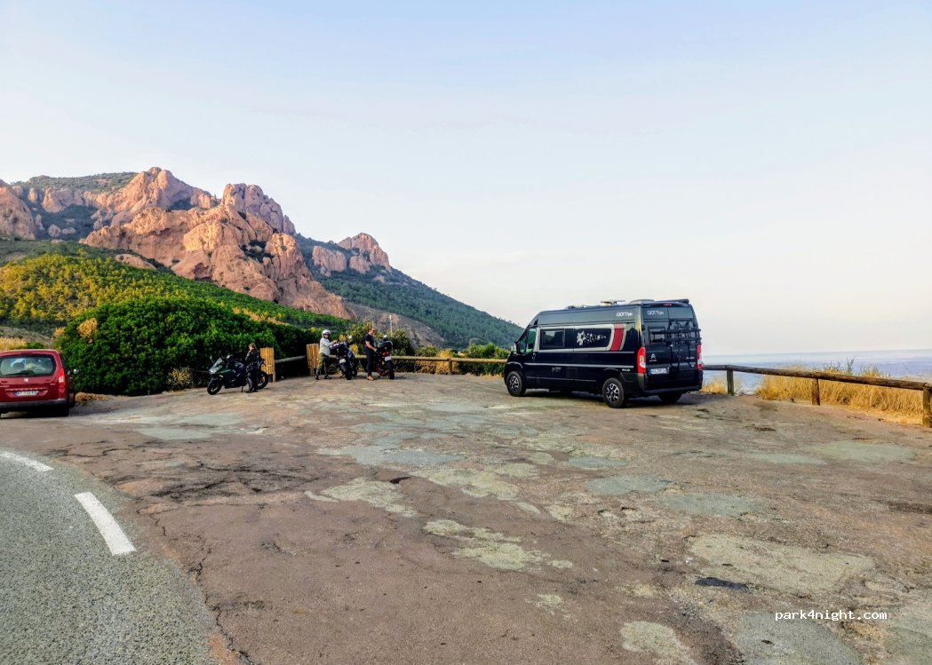 Vue splendide sur l’esterel et sur la mer. Du passage sur la route (beaucoup de motos) donc un peu bruyant la nuit. Il vaut mieux être équipé en toilettes car c’est très escarpé en dessous.