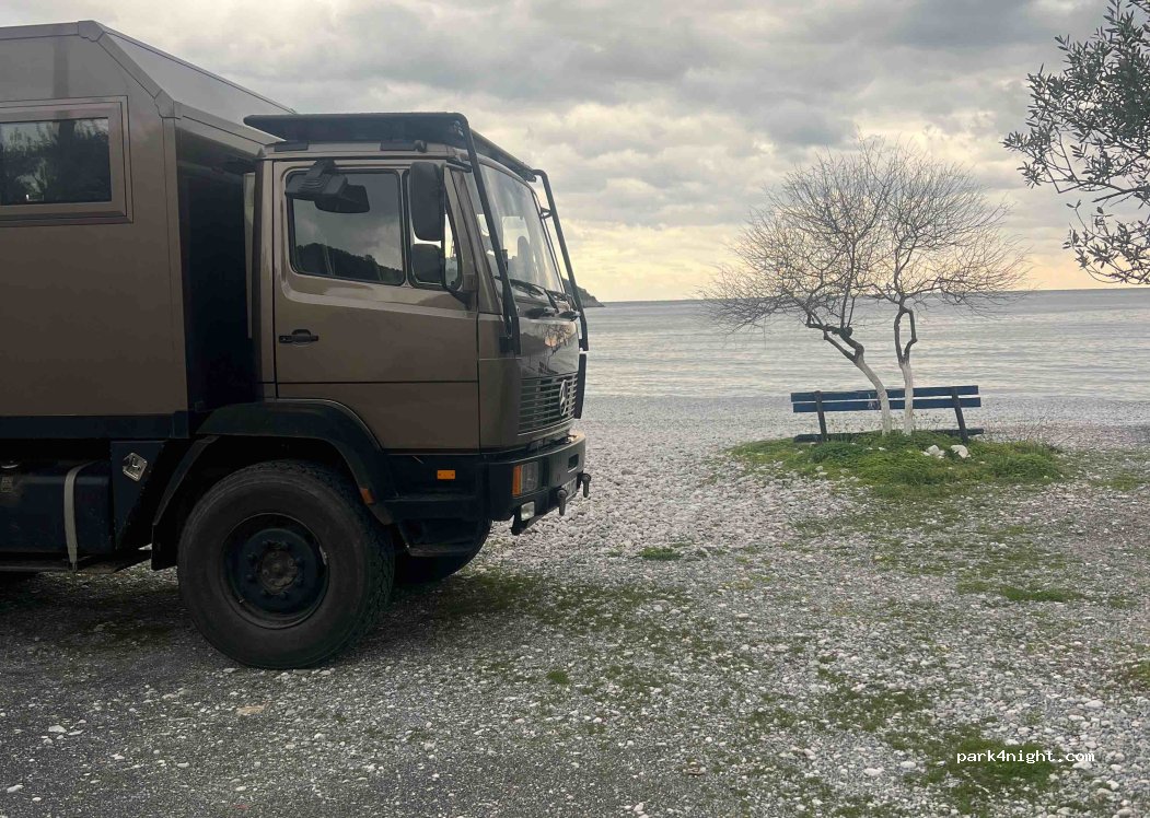 Solide und günstige griechische Taverne, mit netten Personal. Standen über Nacht. Öffentliche Toiletten vorhanden (wäre cool, wenn die auch genutzt werden…Teilweise hat es nach Fäkalien gerochen und es lag Klopapier rum). Besuch in der Taverne nicht zwingend notwendig, um dort zu übernachten. Kein Camping-Verboten-Schild. Bei uns kam keine Polizei. Einige hatten auch Stühle und Markise aufgebaut.