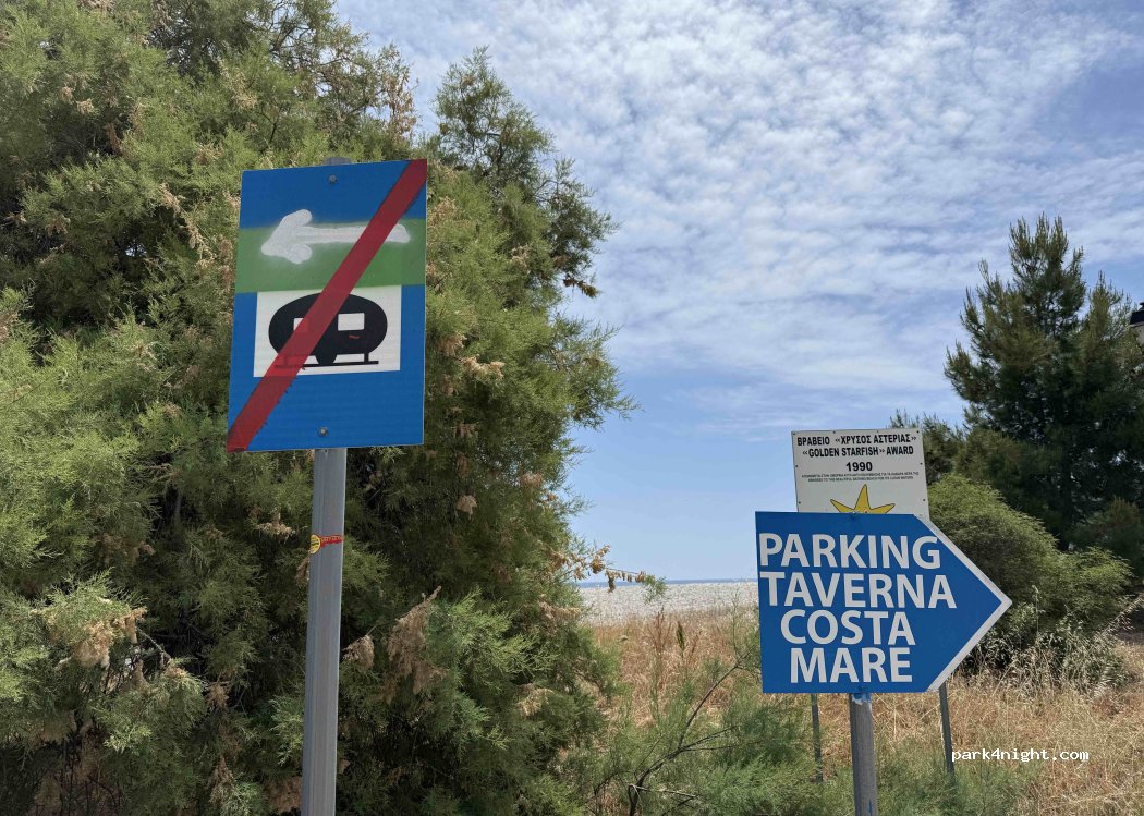 Parken auf weitläufigem Areal neben der Taverne. Es ist ein verlassenes Paradies. Laut Taverne überhaupt kein Problem auch mehrere Wochen zu übernachten. Preisgünstiges Essen und schöne Atmosphäre.