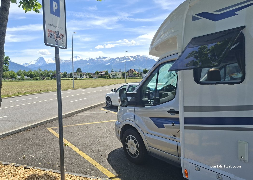 Gratis Stellplatz für Camper aller Grössen - vielen Dank an die Stadt! Zum Übernachten eher ungeeignet, da viel Verkehr. An den Wochenenden zudem oft wegen Fussballspielen gesperrt (einfach googlen, ob Thun ein Spiel hat). 2min zu Fuss ins Einkaufszentrum.