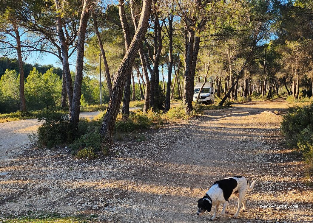 Bon plan pour être au calme dans un cadre boisé, chemin non goudronné mais accessible même avec un grand camping-car, à 5 minutes de l'autoroute donc idéal pour y dormir sans faire un grand détour quand on descend sur Marseille. Beaucoup de places.