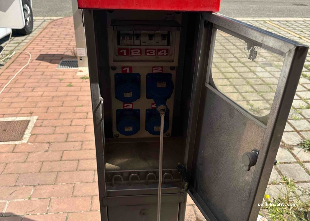 4 posti camper (due però sullo scarico) e colonnina con 4 attacchi elettrici gratuiti.
