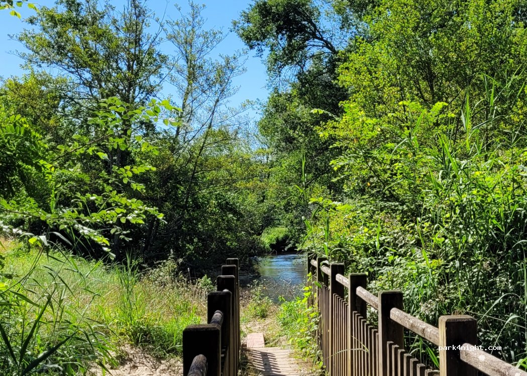 Super spot! Très bel et grand espace qui s'étire de part et d'autre de la petite route, le long d'une rivière. Barre à 2m10 hyper calme et propre, nous y avons passé une nuit sans aucun problème d'un côté, il y a un espace pique nique couvert avec des toilettes, et de l'autre côté, un très grand espace avec un parcours de remise en forme ou nous n'avons vu personne! nuit parfaite!