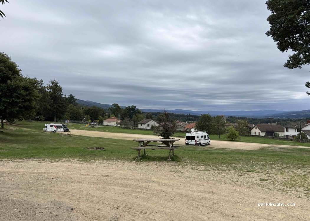 très bel endroit spacieux, bien situé. au calme. aire gratuite. eaux, vidanges eaux grises et noires. "petite caisse" située au niveau du grand bâtiment afin d'y laisser une petite pièce si vous le souhaitez. les commerces sont à 500m ( épicerie/point presse) une boulangerie qui fait de l'excellent pain ( notamment leur pain au seigle à la fourme d'Ambert : une tuerie !), une poste.