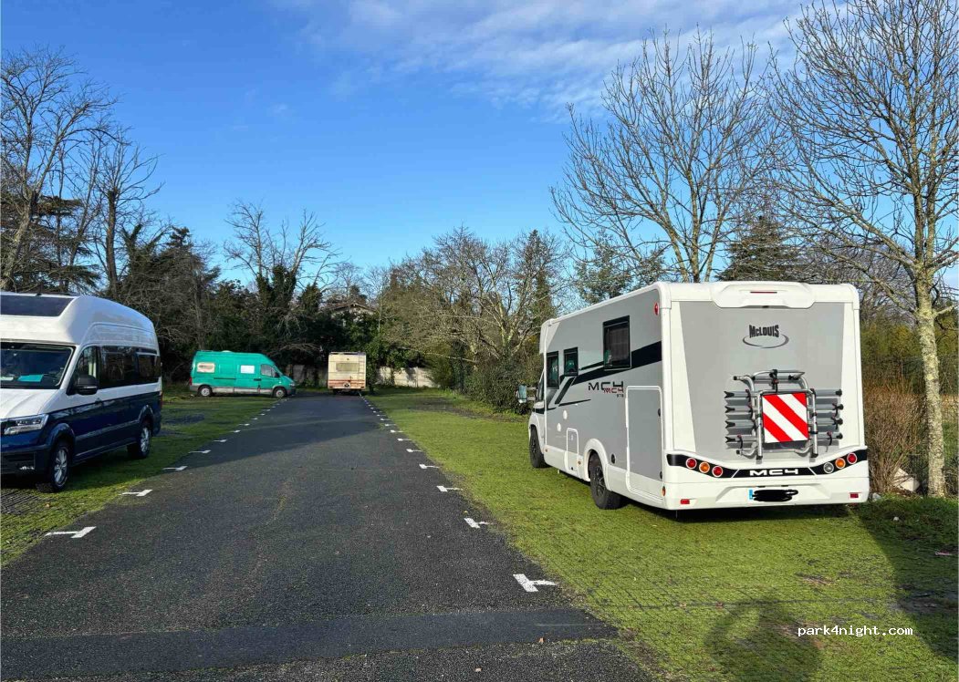 Parking bien fréquenté, nuit calme sauf au petit matin ( très tôt) bcp de bruit avion peut être!?…. Sinon bien . ATTENTION ne pas sortir dans le bon sens des flèches car petite rampe difficile pour les longs CC … un camping-car s’est vu arraché le pare-chocs!SORTIR par le sens interdit sur le parking