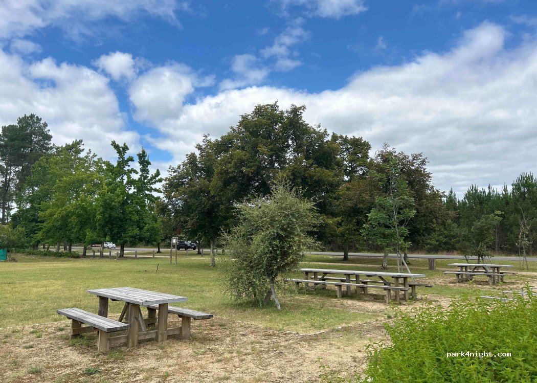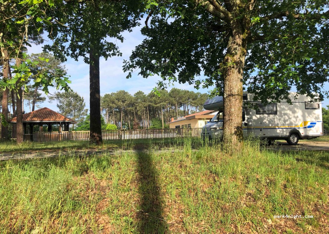 à l'ombre des pins face à la piscine et au court de tennis ou sur les parking délimités nouvellement aménagés. très bon endroit pour pique niquer mais pas pour dormir, route très passagère et bruyante .
