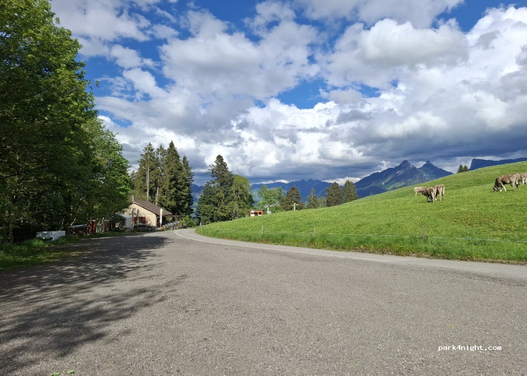 Parking La Brasserie La Chia, down the slopes, between forest and pastures. Typical Swiss place, filled with cows in summer (for the production of Gruyère des Alpages). Pretty walk to do around La Chia, crossing small stream and field of cows and atypical chalets Switzerland. No services and brewery open only on weekends in summer. Waking up with the bells and this beautiful landscape is recommended. Be careful, however, to the tortuous and narrow road. (Perhaps you will have the chance to see the Poya, the Swiss transhumance)