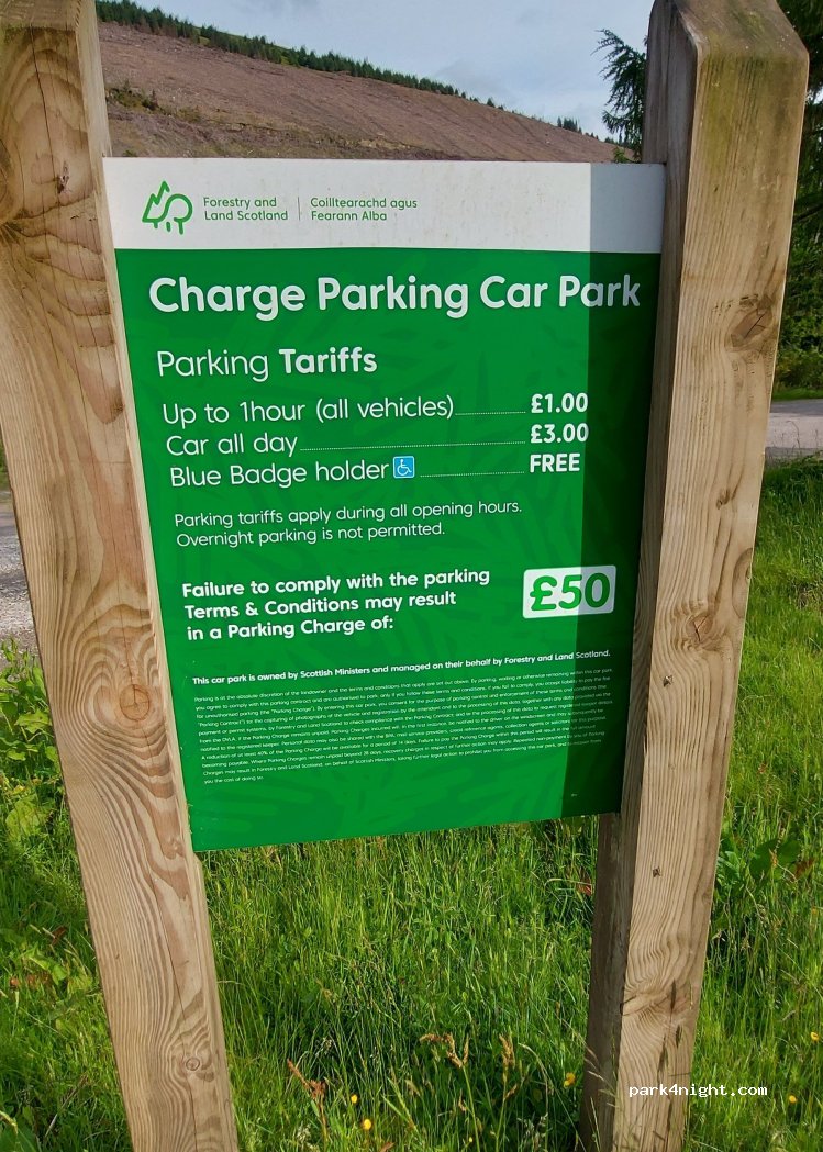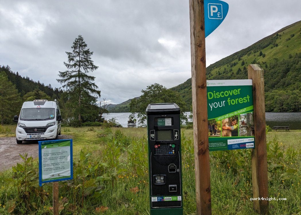 Très bel air de repos. Je n ai pas vu d'interdiction pour la nuit. Route très fréquentée à proximité mais parfait pour une pause en bordure du Loch