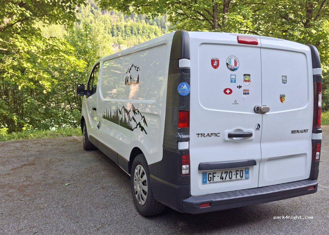 Après avoir vidé les eaux grises, on s'était posés sur le parking en pensant être tranquilles pour la nuit ... Mais au bout de 5 mn une bagnole arrive et se gare juste en face de nous avec 2 gars louches qui n'étaient manifestement pas venus cueillir des champignons. On a préféré partir pour se mettre en sécurité un peu plus haut dans le vieux village d'Allemont tout près de l'église ...