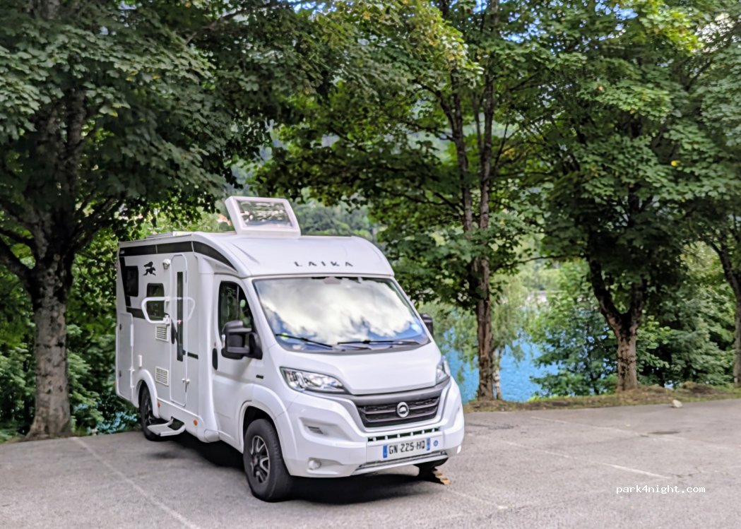 Juste passé la nuit sur le parking qui jouxte l'aire de service. Parking en pente, prévoir des calles. Calme et sécure. Passage de la Police Municipale... RAS. Sur la route du Tour de France, on était 8 VR pour la nuit. J'ai juste vidangé les eaux grises. Belle vue sur le lac. Bien.
