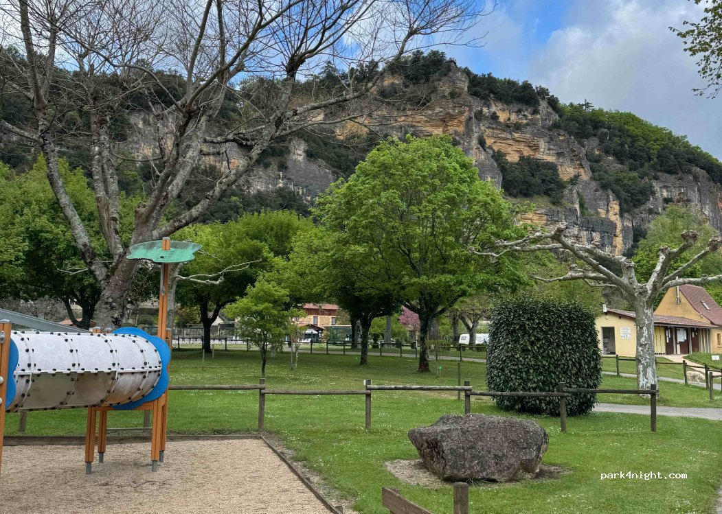 Aire CampingCarPark à l’entrée du camping, très propre, terrain plat, pas loin de la Dordogne et du village de Laroque Gageac, dommage le long de la route.